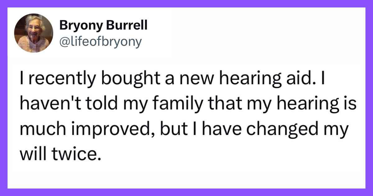 I recently bought a new hearing aid. I haven't told my family that my hearing is much improved, but I have changed my will twice.