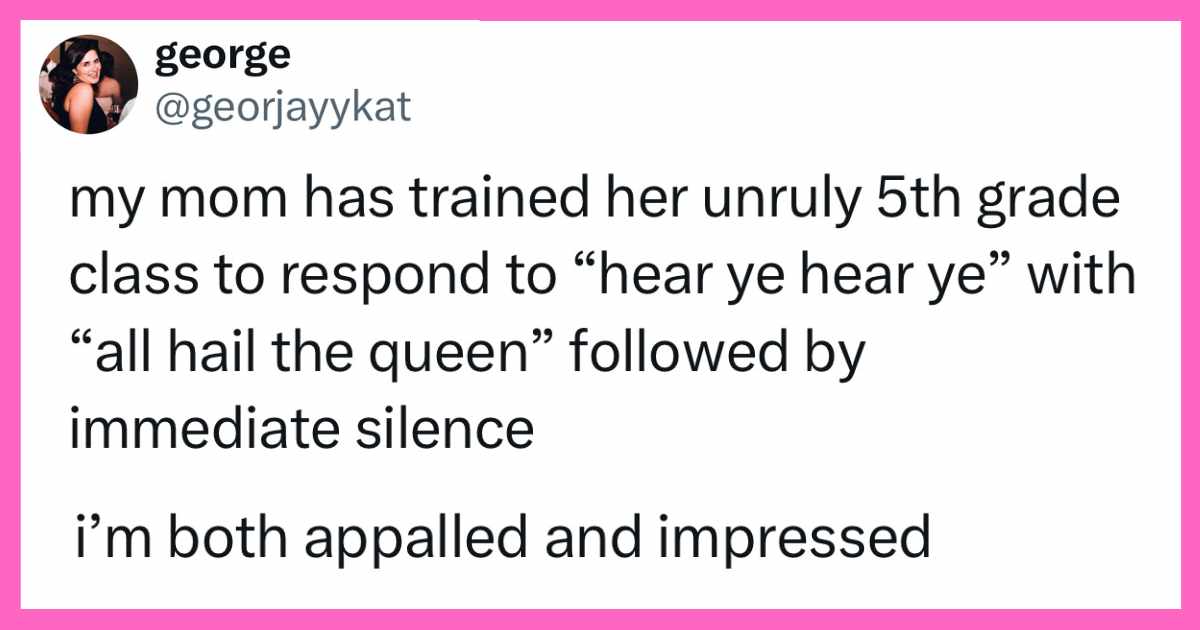 my mom has trained her unruly 5th grade class to respond to “hear ye hear ye” with “all hail the queen” followed by immediate silence