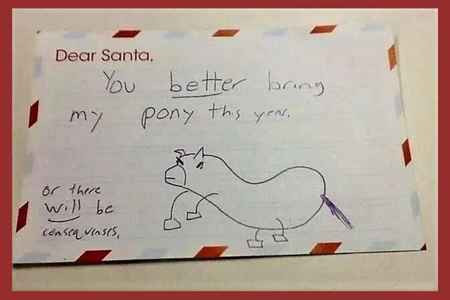 #1 This brave kid writes “Dear Santa, You better bring my pony this year. Or there WILL be consequences.” Umm…not sure if threatening Santa is your best move, kid!