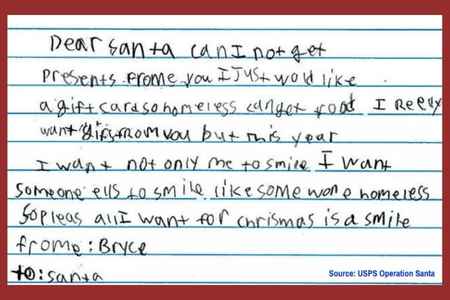 #3 Sweet little Bryce writes…“Can I not get presents from you. I just would like a gift card so homeless can get food. I really want gifts from you but this year I want not only me to smile I want someone else to smile.”