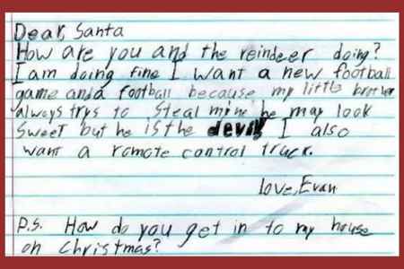 #6 Evan writes, “Dear Santa, How are you and the reindeer doing? I am doing fine. I want a new football game and a football because my little brother always trys to steal mine he may look sweet but he is the devil. I also want a remote control truck. Love, Evan P.S. How do you get in to my house on Christmas?”
