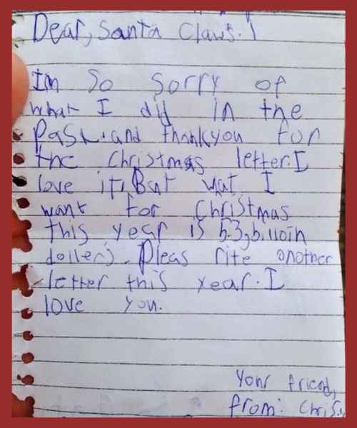 #10 Chris writes, “Dear Santa Claws: I’m so sorry of what I did in the past. Thank you for the Christmas letter. I love it. But what I want for Christmas this year is 53 billion dollars. Please rite another letter this year. I love you.”