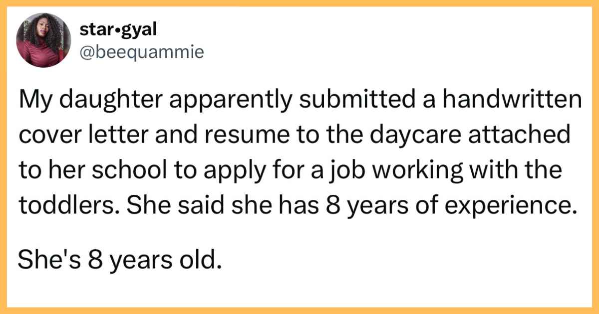 My daughter apparently submitted a handwritten cover letter and resume to the daycare attached to her school to apply for a job working with the toddlers. She said she has 8 years of experience.
